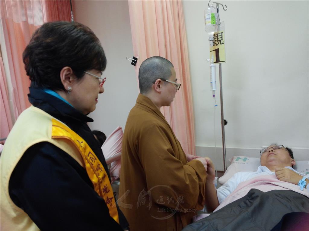 圖說:佛光山慈悲基金會北區執行長朱唐妹(左起)、佛光山人間大學台北分校知貫法師,前往台北市立聯合醫院忠孝醫院,關心飽受驚嚇的計程車司機。