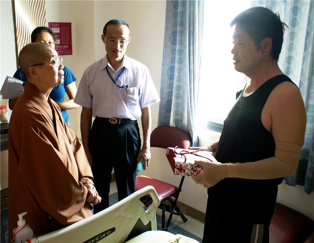 依來法師準備佛珠、大悲咒水和月餅禮盒,到長庚醫院加護病房及802國軍高雄總醫院,探視氣爆救災警員及警專實習生陳瑋、林惠雯、張明煌及李季軒等,表達佛光人的關懷與祝福。她貼心的噓寒問暖,人民保母均感動不已,為秋節增添幾許溫馨。