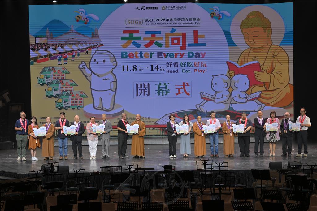 心保和尚帶領眾貴賓人手一本好書,在倒數聲中宣布「佛光山2025年書展暨蔬食博覽會」正式啟動。
