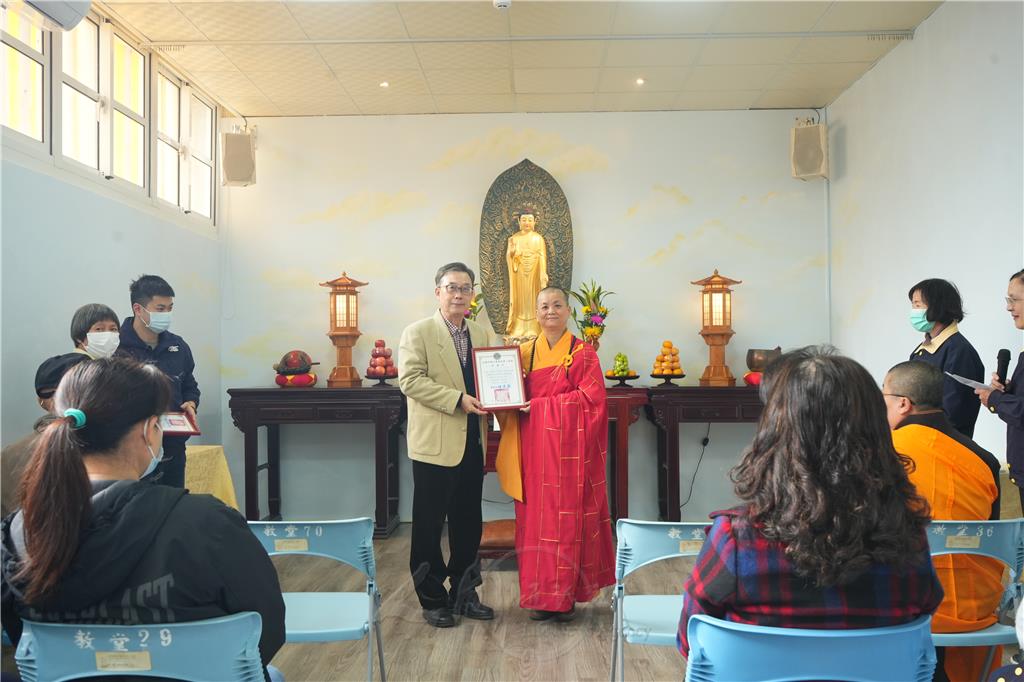 圖說:南二監典獄長陳育鼎(中左)頒贈感謝狀,感謝佛光山慈悲社會福利基金會推動心靈教化,由佛光山慈善院副院長妙璋法師(中右)代表接受。 圖/台南第二監獄提供