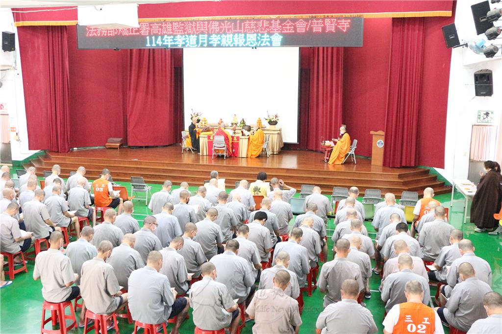 農曆七月是佛教「孝道月」亦是「吉祥月」、「報恩月」,是實踐孝道的重要時節。財團法人佛光山慈悲社會福利基金會、佛光山普賢寺,9月9日假法務部矯正署高雄監獄,舉辦「114年高雄監獄孝道月孝親報恩法會」。由普賢寺監寺知貫法師主法,偕同普賢寺、慈悲基金會法師群、佛光社輔佈教師、普賢寺香燈義工;高雄監獄典獄長林明達率行政同仁、教化科長江俊賢,戒護科長黃建瑋共同參與,收容人虔誠的雙手合十,場面莊嚴肅穆,近百位恭逢盛會共霑法益。