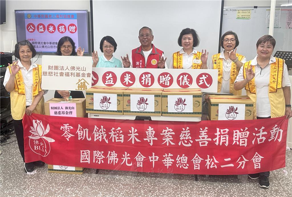響應國際佛光會「零飢餓買一送一稻米稻米專案」,中華總會松山第二分會與慈悲基金會攜手,於9月22日捐贈公益米11箱共132包、麵線2大箱予中華民國老人福利協進會。