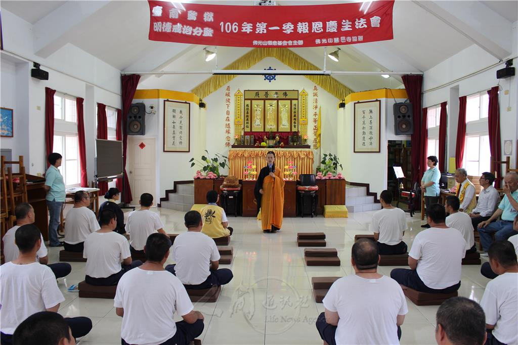佛光山慈悲社會福利基金會3月22日在台南監獄明德戒治分監舉辦「106年第一季報恩慶生法會」,為佛教班同學1~3月的壽星祝福。50名收容人恭敬虔誠魚貫獻燈,並於佛前發願「常隨佛學、勇猛精進、具慈悲心、祈願一切圓滿。」